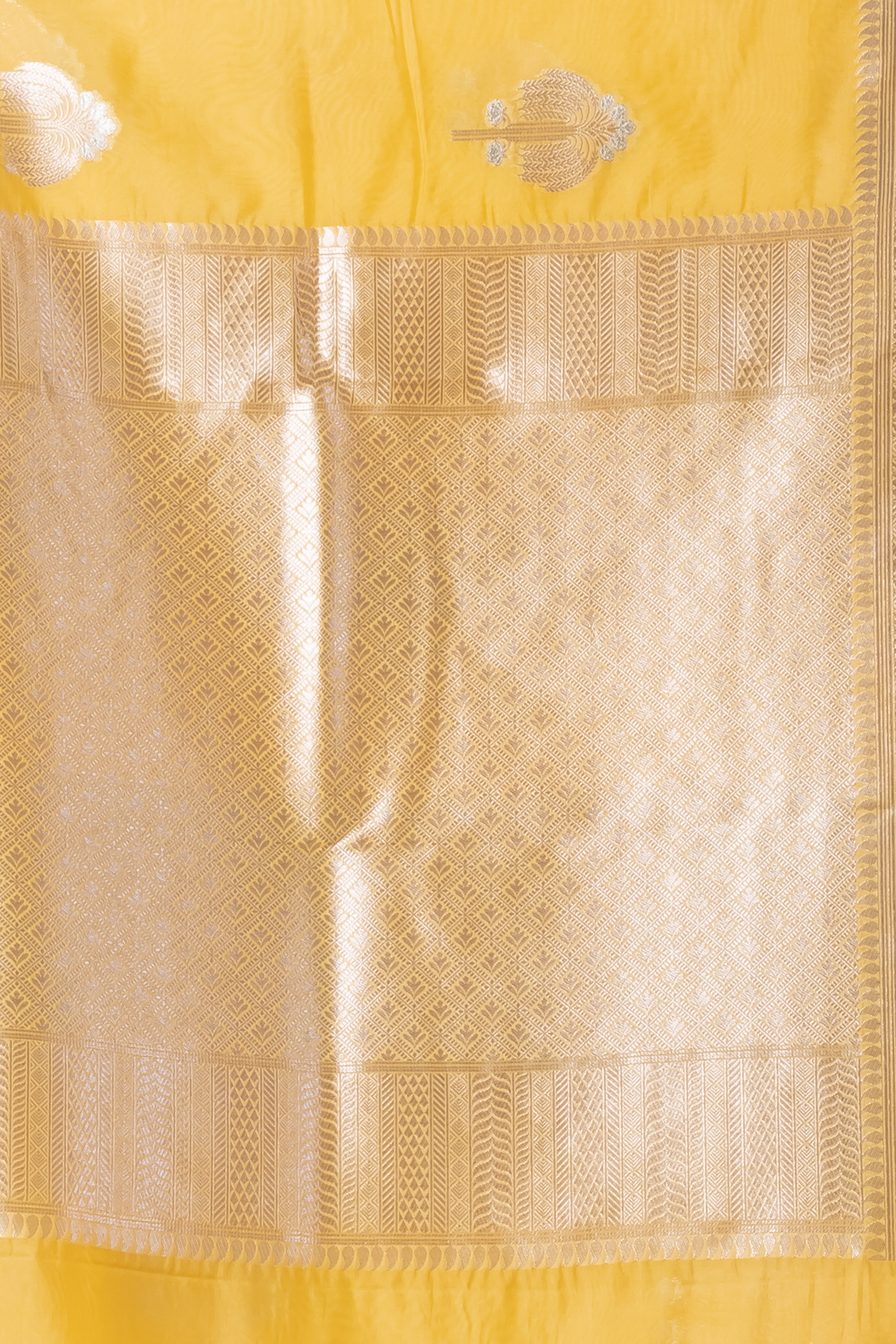 KAVVYA SOFT & LIGHT WEIGHT YELLOW SILK SAREE WITH BEAUTIFUL PALM TREE MOTIFS ON THE SAREE. WITH SMALL TEMPLE BORDER. This vibrant yellow silk saree features intricate palm tree motifs and a delicate temple border, offering a perfect blend of traditional elegance and modern style.