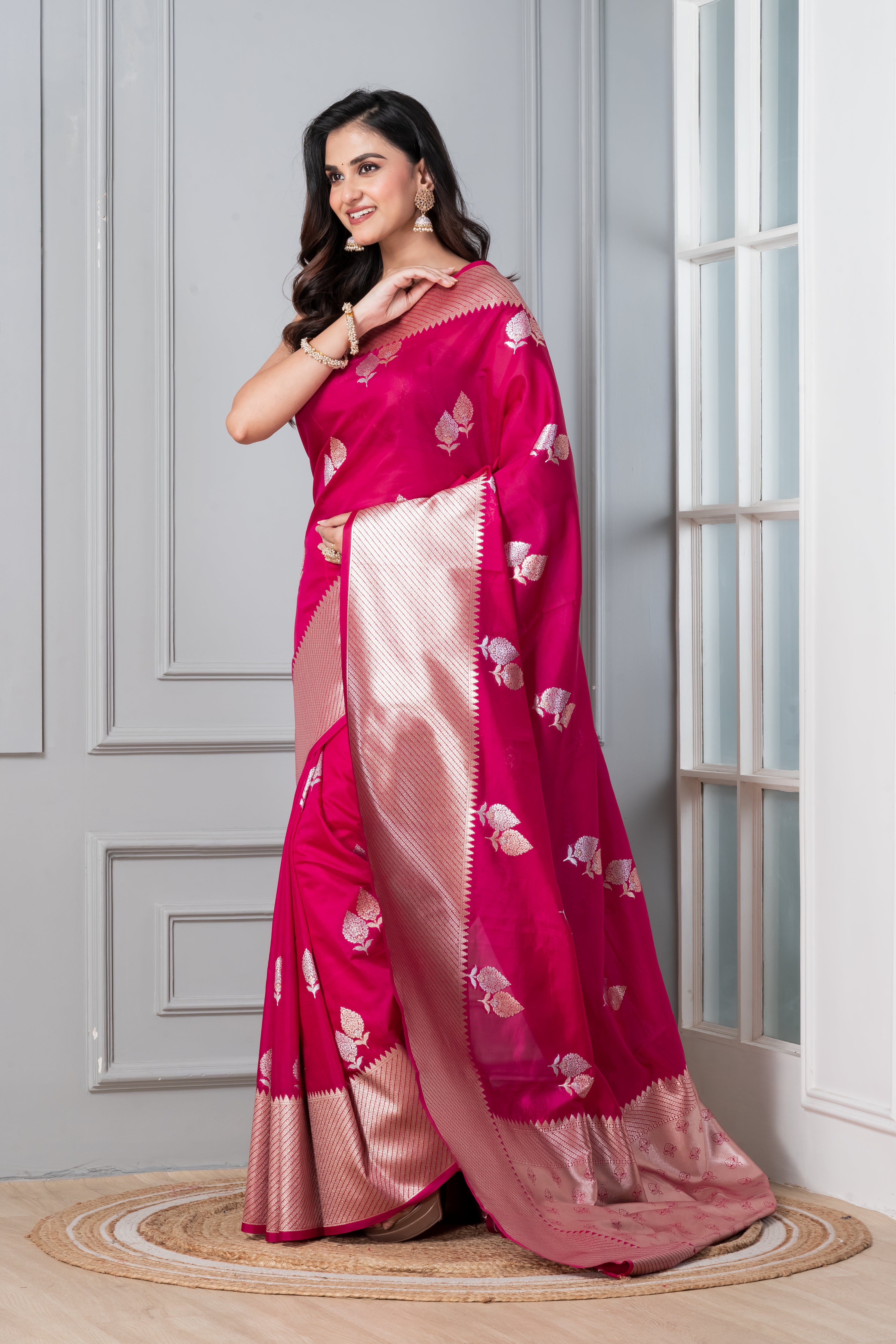 The KAVVYA rani silk saree combines softness and lightweight comfort with intricate craftsmanship. Featuring elegant gold and silver zari floral motifs, it is enhanced by a heavy border and pallu that add depth and richness. Accompanied by a matching blouse, this saree exemplifies refined tradition, making it an excellent choice for formal events and cultural celebrations.