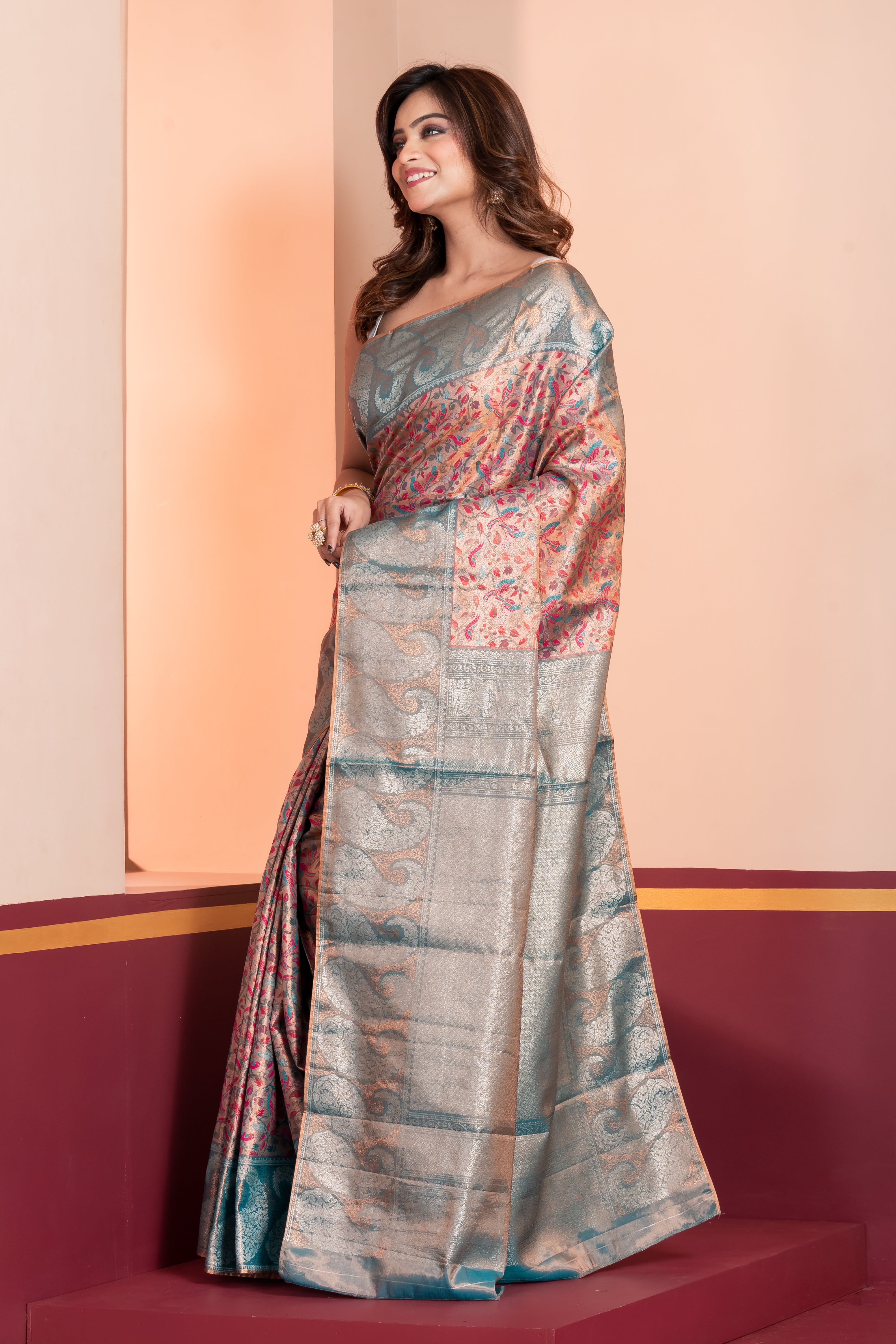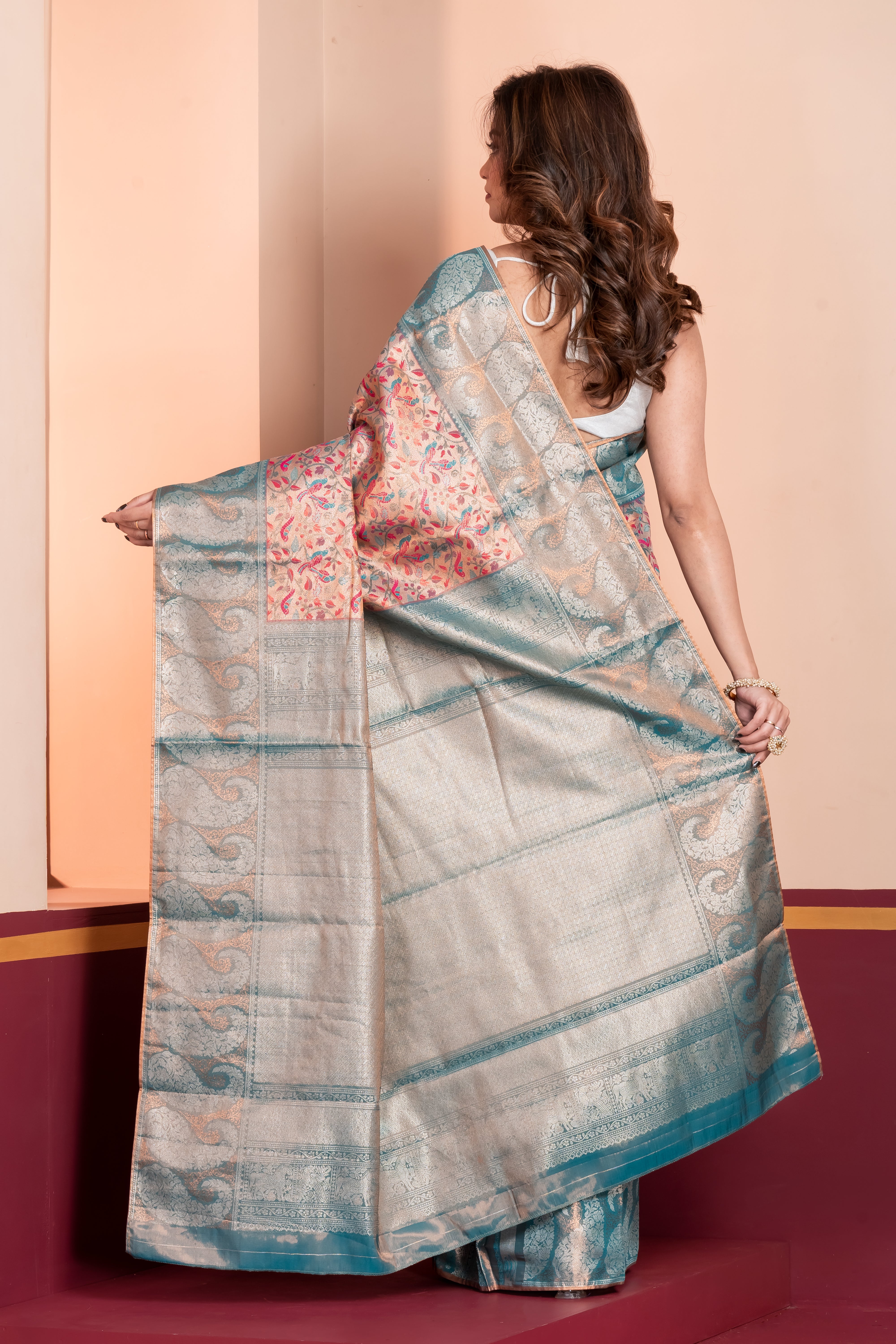 KAVVYA soft & lightweight metallic brass colour weaving silk saree with an unstitched blouse piece. This stunning saree features beautiful metallic brass color weaving with body,ike mango motif border and gorgeous pallu, creating an elegant and luxurious look perfect for special occasions.