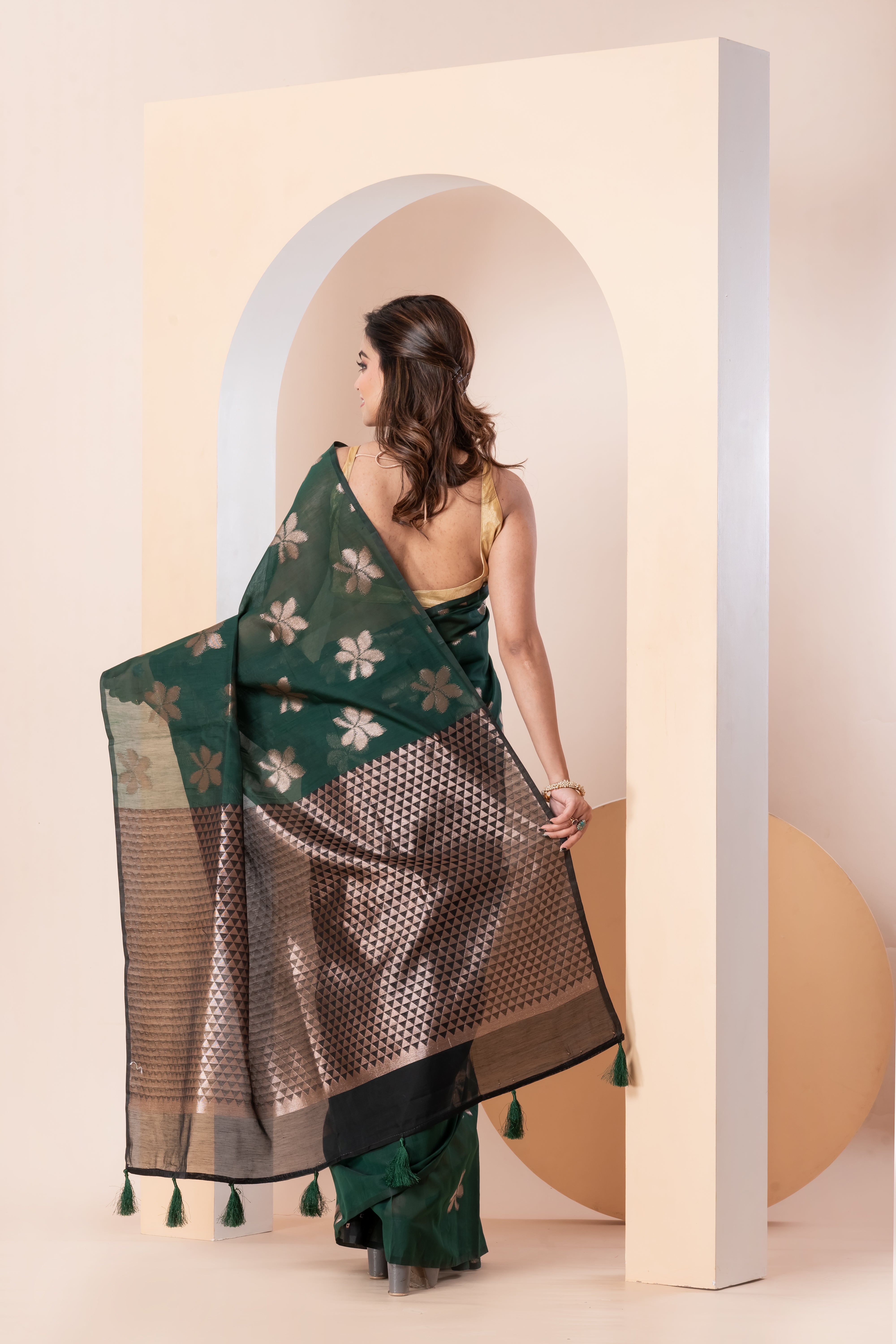 Experience elegance with this soft and lightweight maroon handloom saree, featuring delicate floral weaves throughout the body. The contrasting mustard pallu and blouse add a refined touch, making it perfect for sophisticated occasions. Crafted for comfort and style, this saree effortlessly blends traditional artistry with contemporary grace.