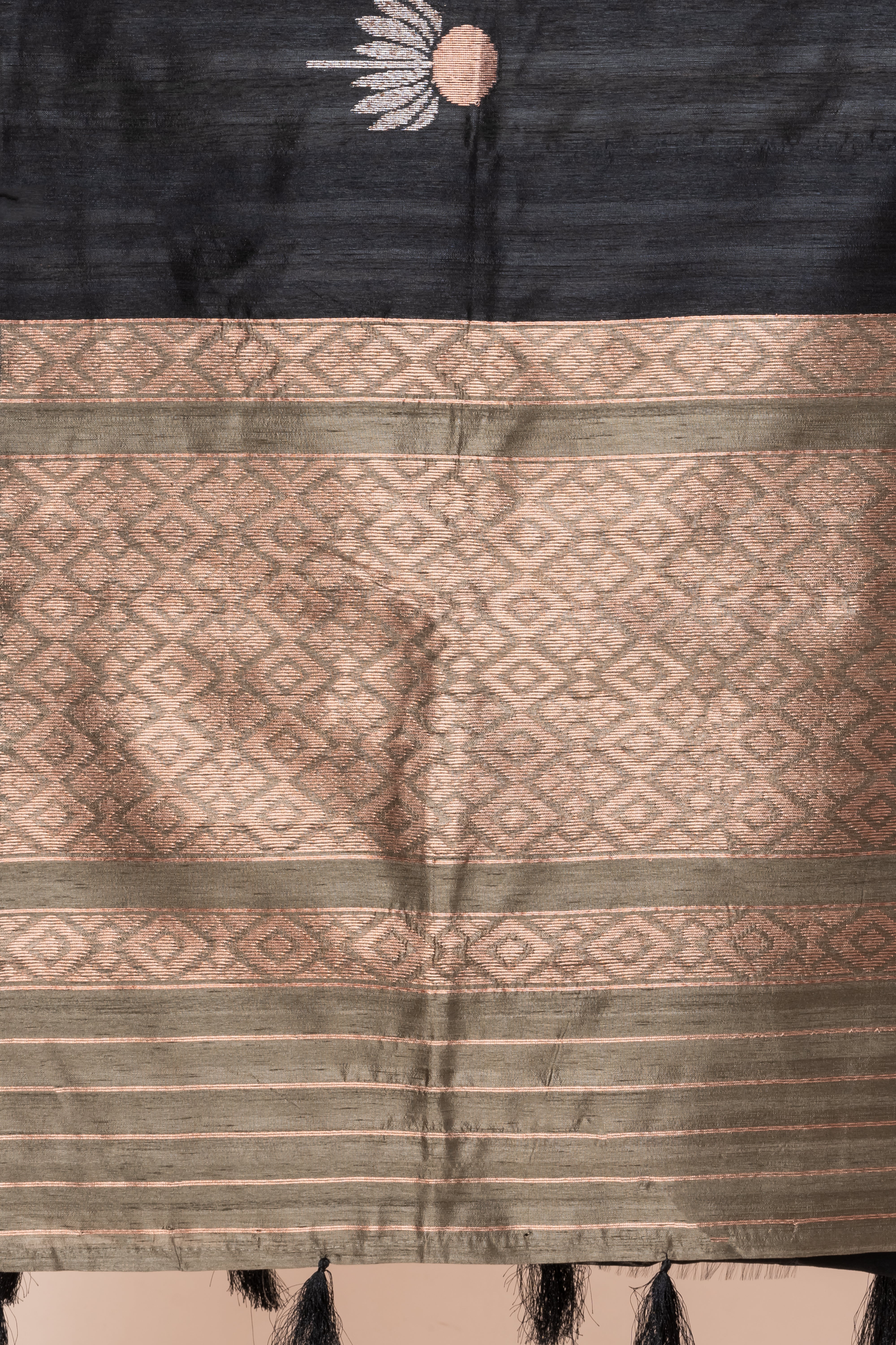 KAVVYA SOFT & LIGHT WEIGHT BLACK HANDLOOM TUSSAR SILK SAREE WITH BEAUTIFUL GEOMETRIC ROUND MOTIFS ALL OVER...