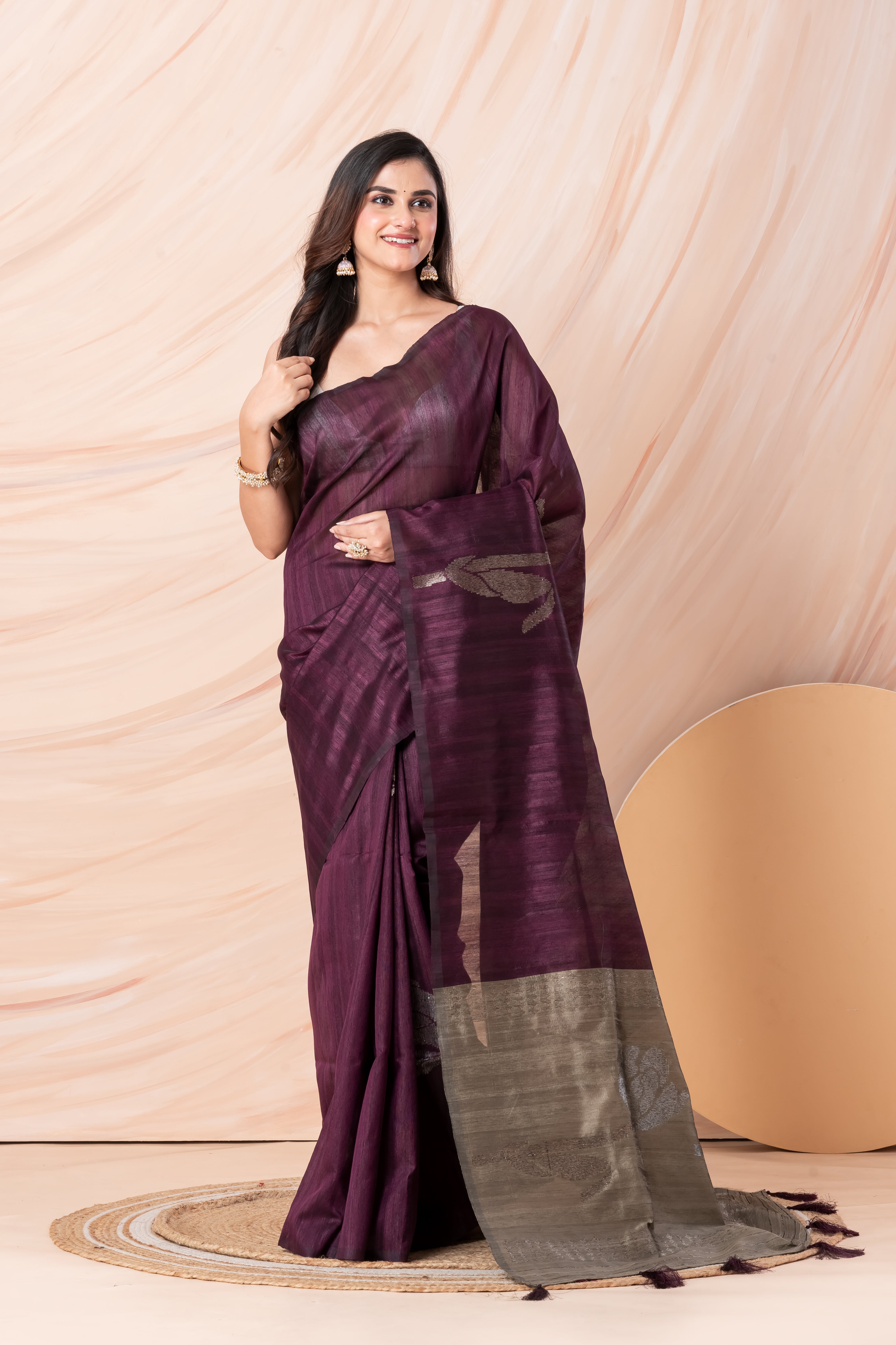 KAVVYA SOFT & LIGHT WEIGHT WINE HANDLOOM WEAVED SAREE WITH BEAUTIFUL BIG FLORAL MOTIFS ALL OVER THE SAREE. This exquisite wine-colored handloom saree features stunning big floral motifs woven throughout, creating an elegant and eye-catching traditional look perfect for festive occasions.