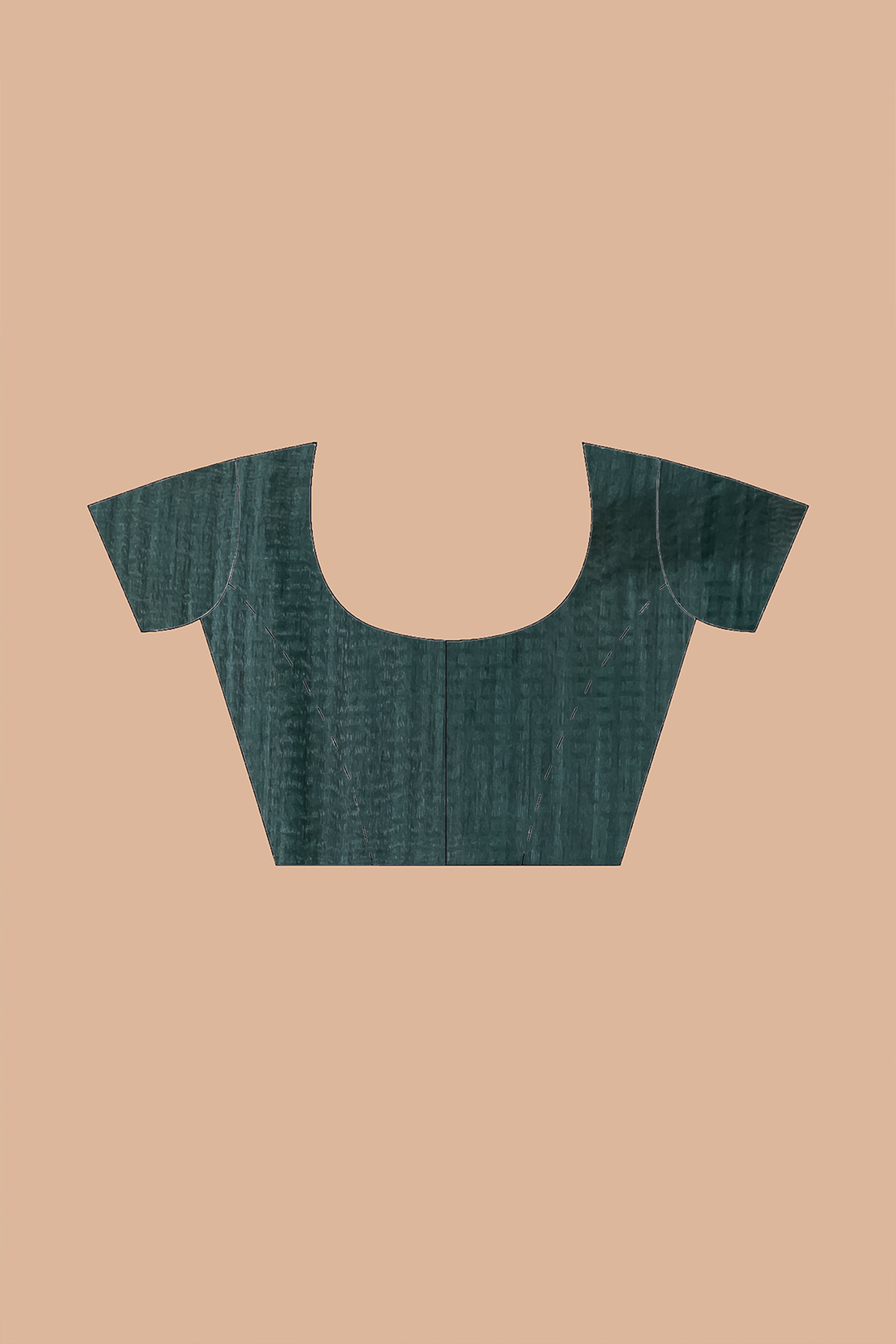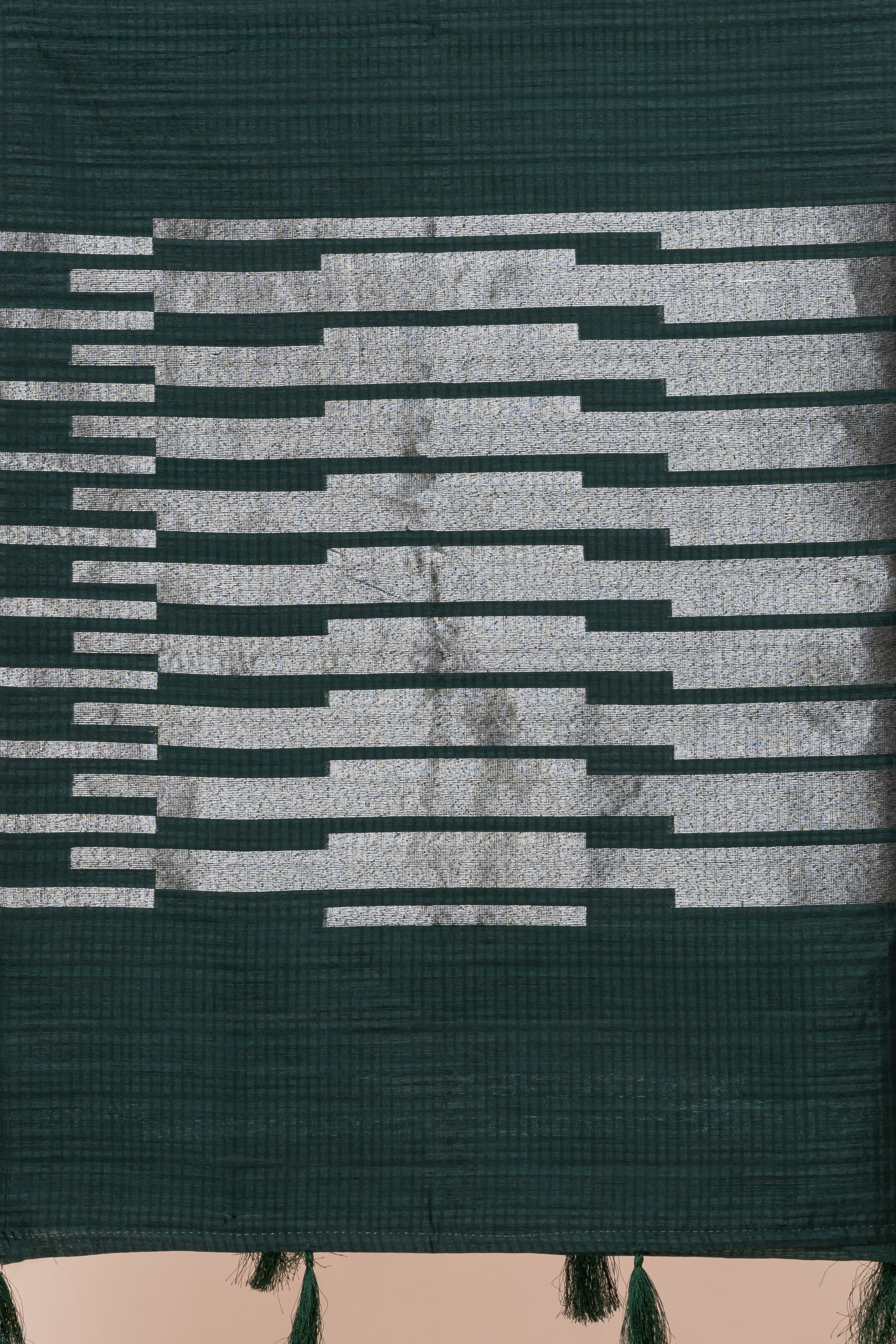 KAVVYA SOFT & LIGHT WEIGHT DARK GREEN HANDLOOM WEAVED TUSSAR SAREE WITH BEAUTIFUL GEMOTRIC FIGURES WOVEN ALL OVER THE SAREE. This stunning dark green tussar saree features intricate geometric patterns woven throughout, creating a sophisticated and elegant look perfect for any special occasion.