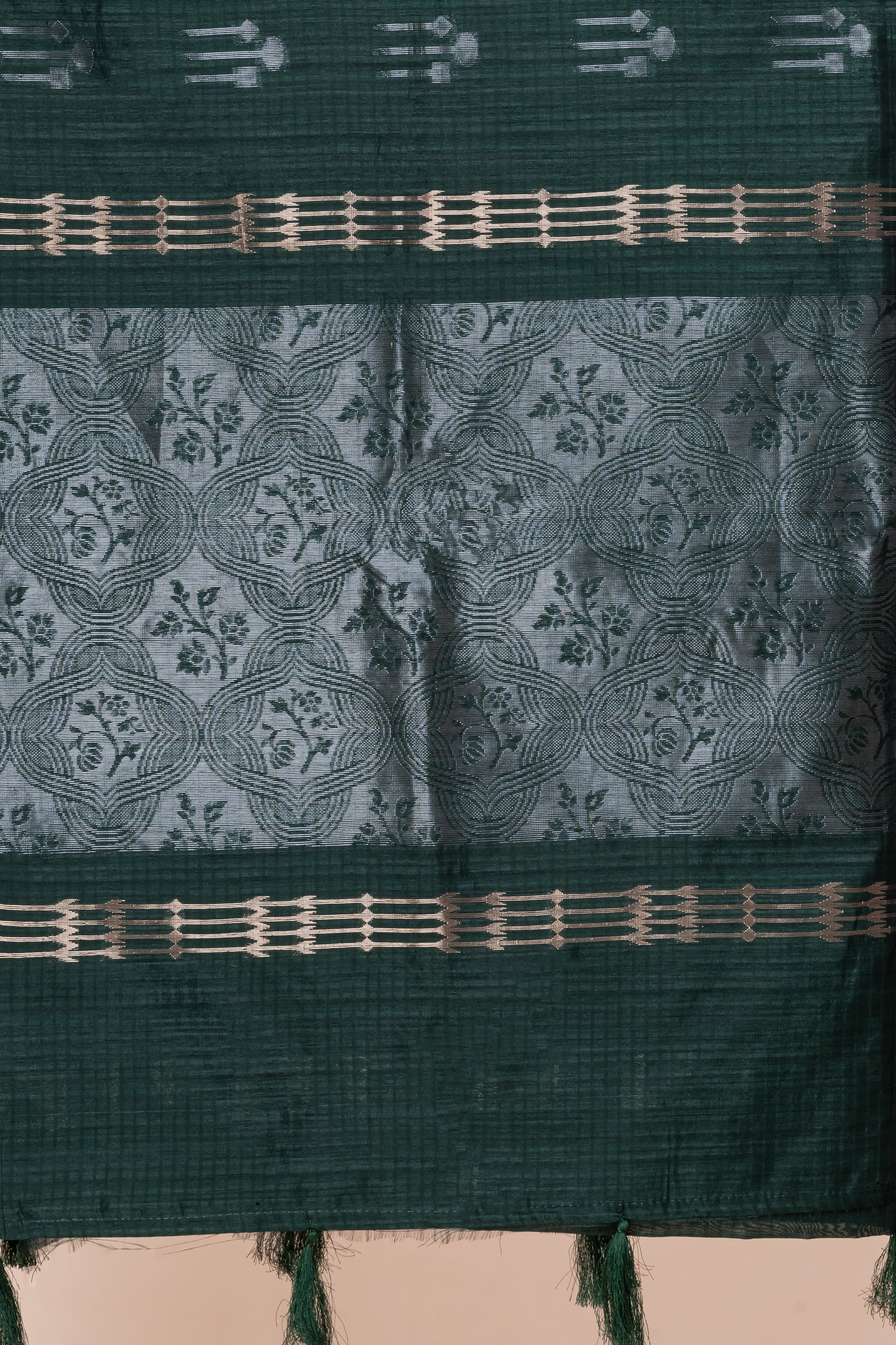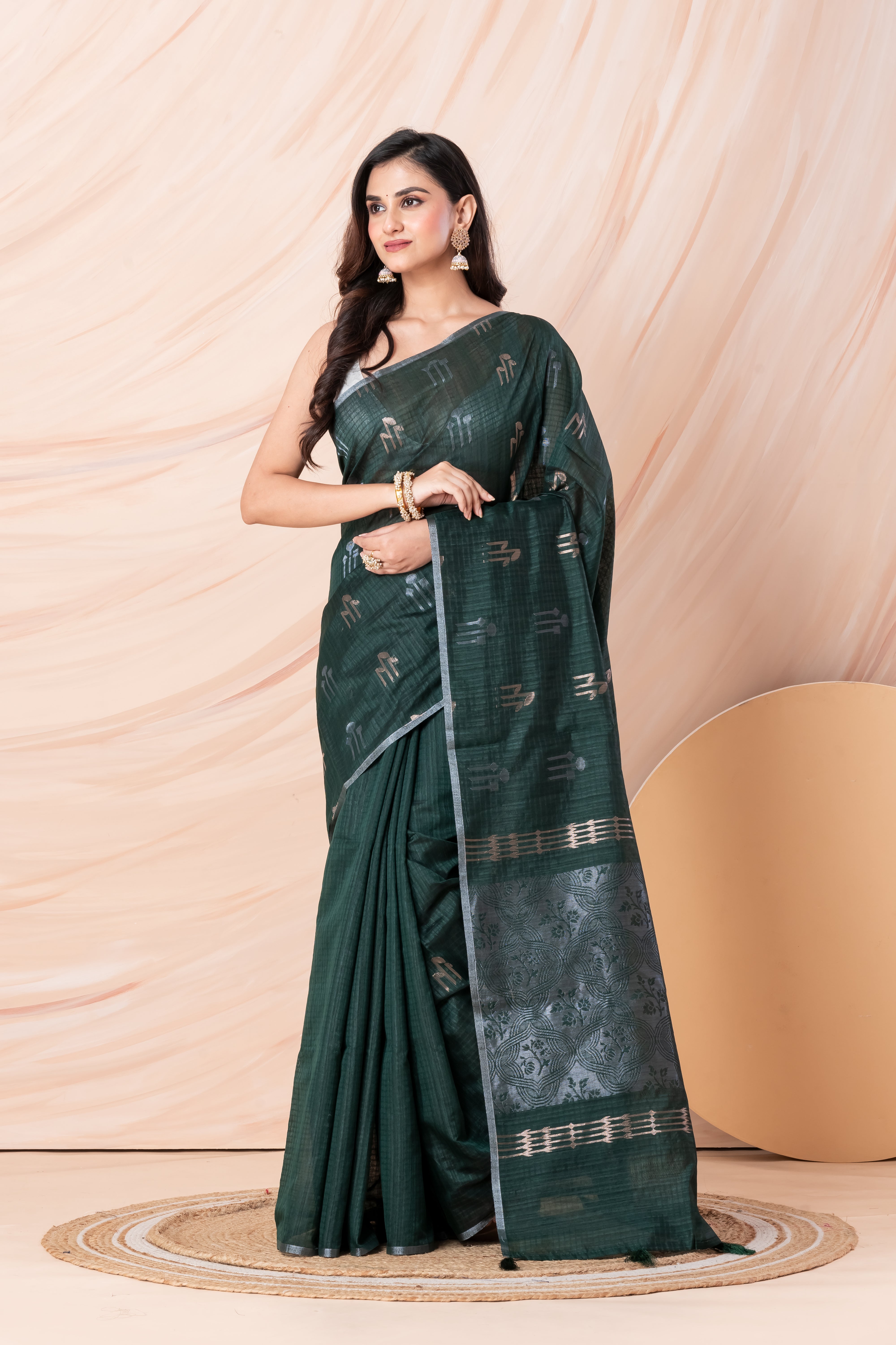 KAVVYA SOFT & LIGHT WEIGHT DARK GREEN HANDLOOM WEAVED TUSSAR SAREE WITH BEAUTIFUL MOTIF PALLU. This elegant dark green tussar saree features beautiful handloom weaving with an exquisite motif pallu, creating a sophisticated and traditional look perfect for special occasions.