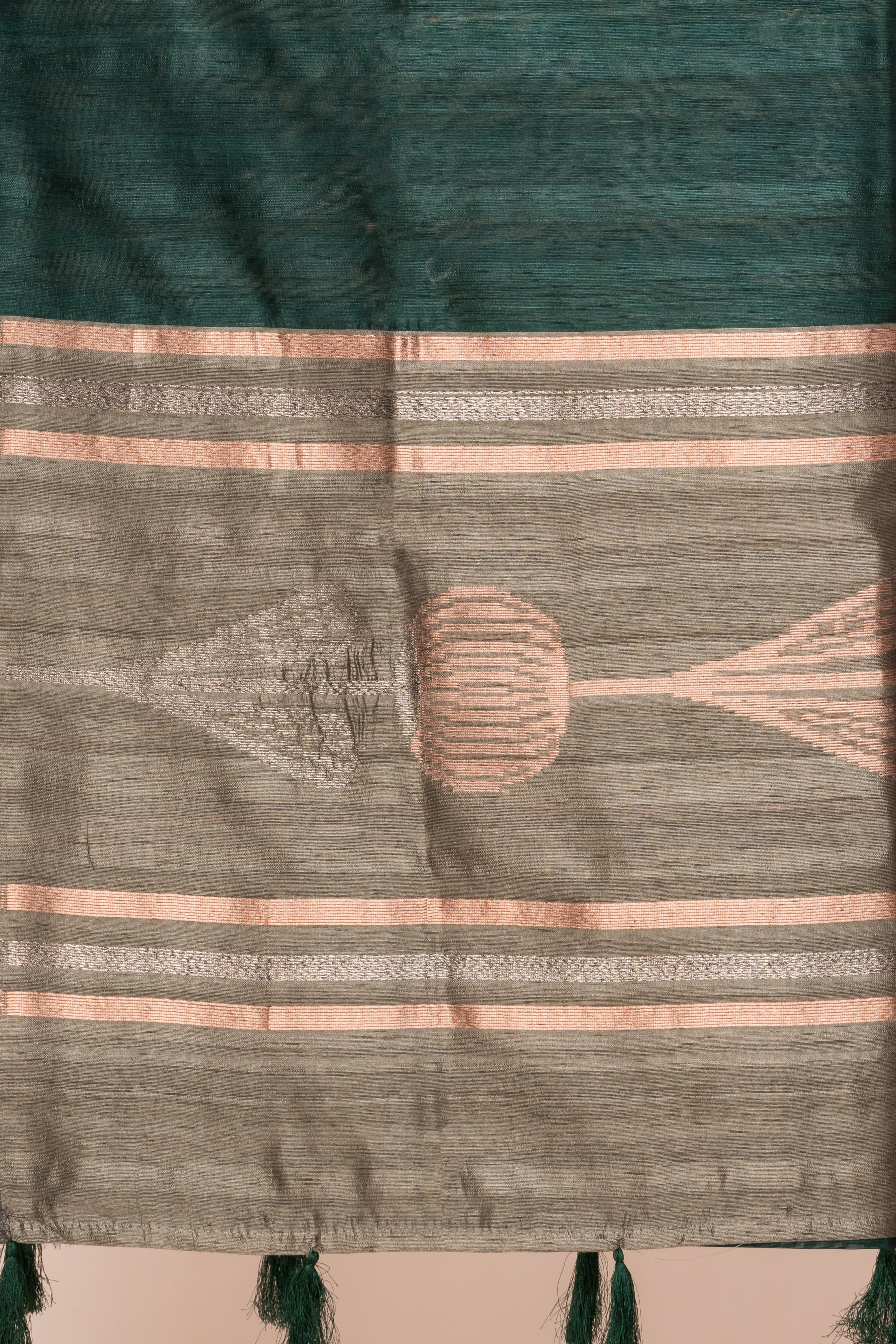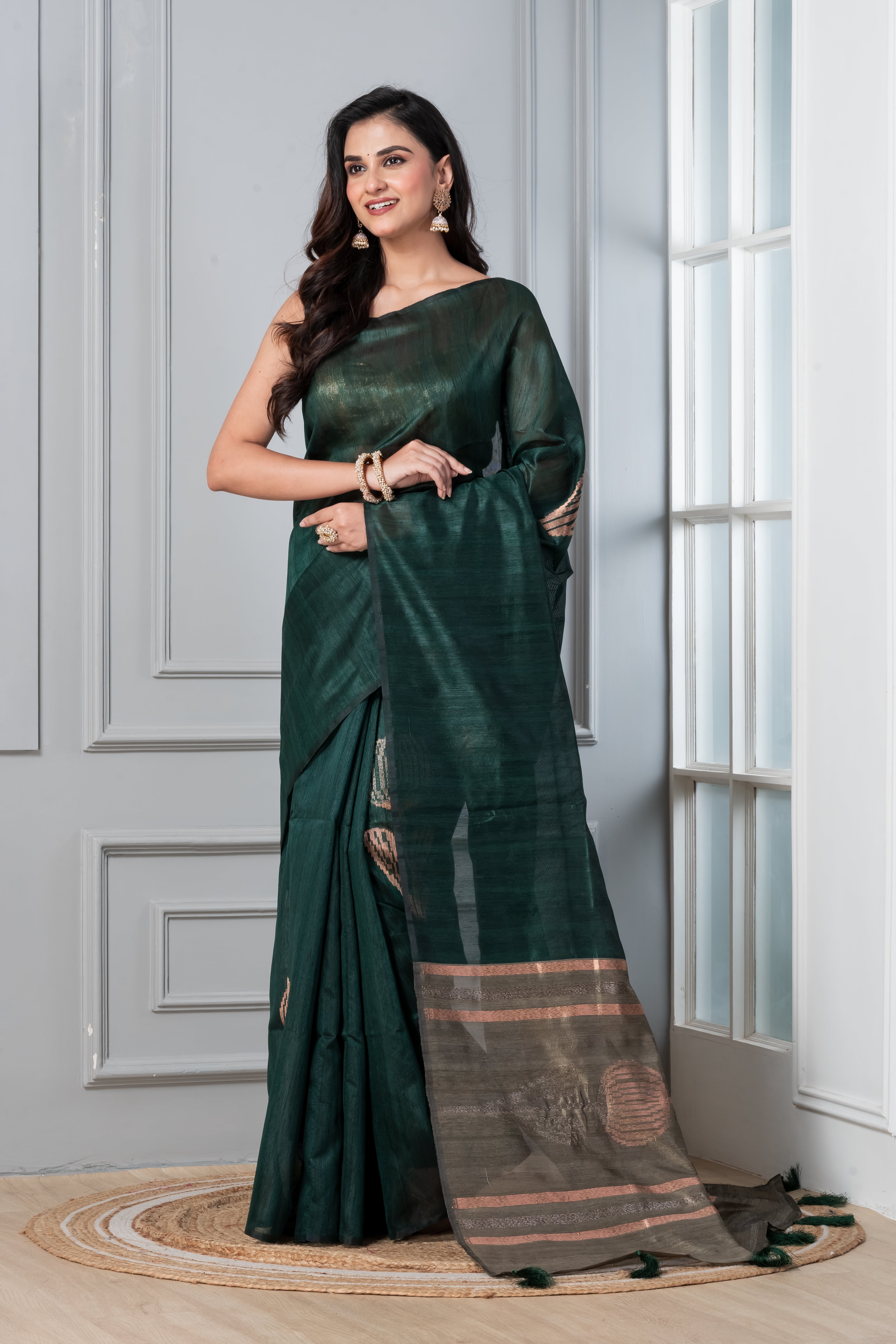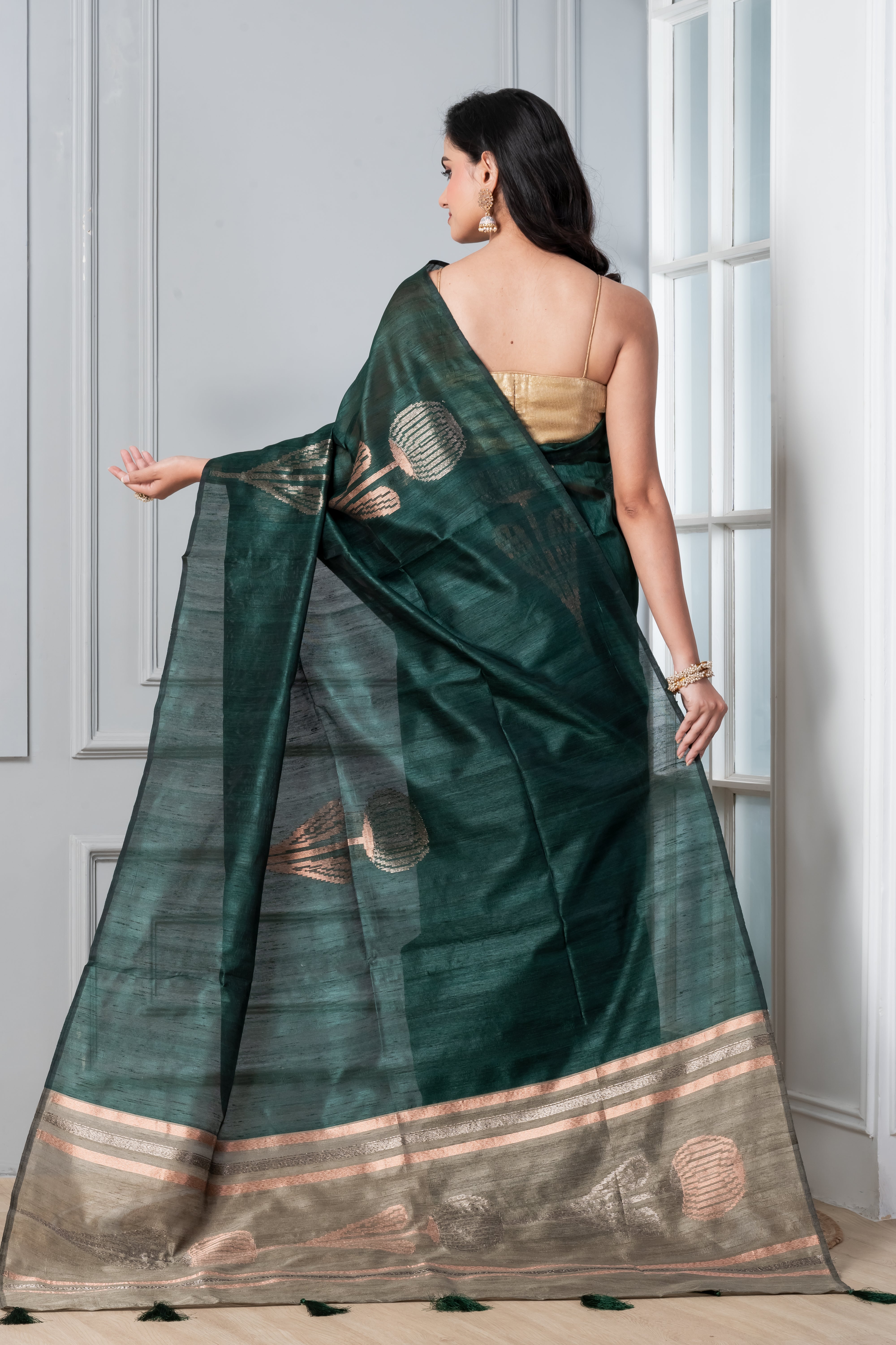 KAVVYA SOFT & LIGHT WEIGHT BOTTLE GREEN HANDLOOM WEAVED SAREE WITH BEAUTIFUL BIG FLORAL MOTIFS ALL OVER THE SAREE. This stunning bottle green handloom saree features beautiful big floral motifs woven throughout, creating an elegant and eye-catching traditional look perfect for festive occasions.