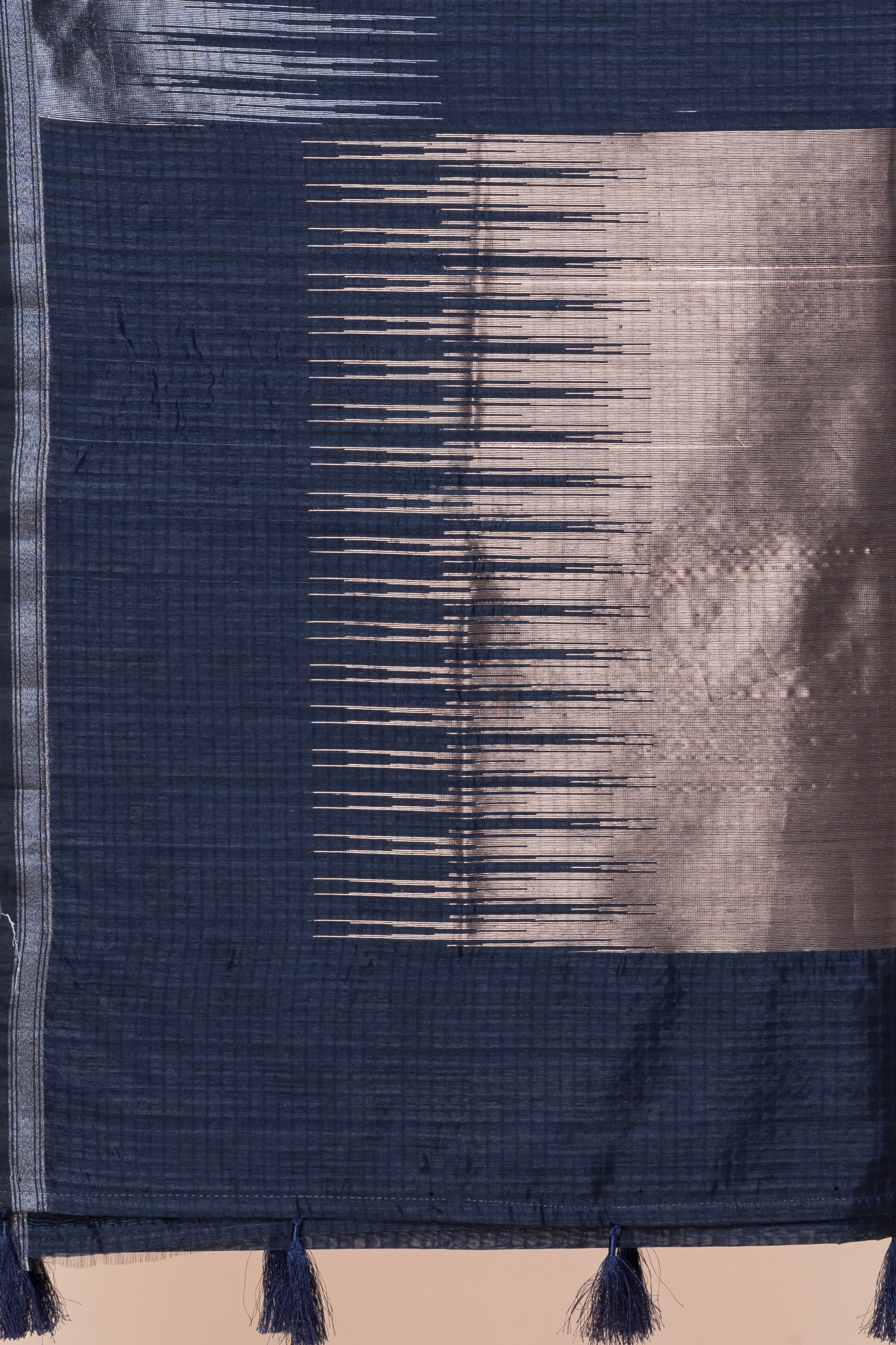 KAVVYA SOFT & LIGHT WEIGHT NAVY BLUE HANDLOOM ROSE GOLD ZARI WEAVING SAREE IN TUSSAR FABRIC WITH BIG FLORAL MOTIFS. This stunning navy blue handloom tussar saree features beautiful rose gold zari weaving with big floral motifs throughout, creating an elegant and luxurious look perfect for festive occasions and special celebrations.