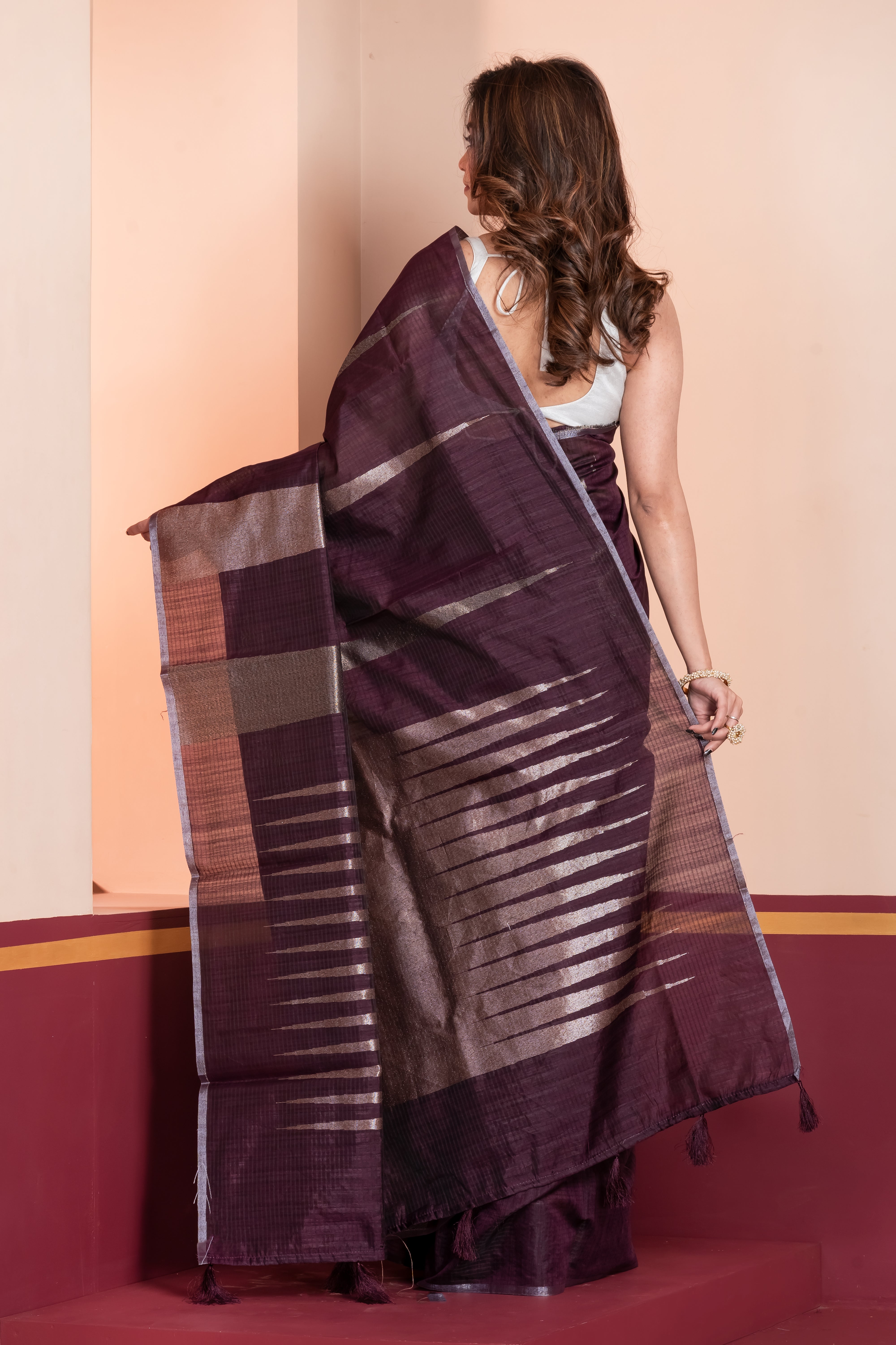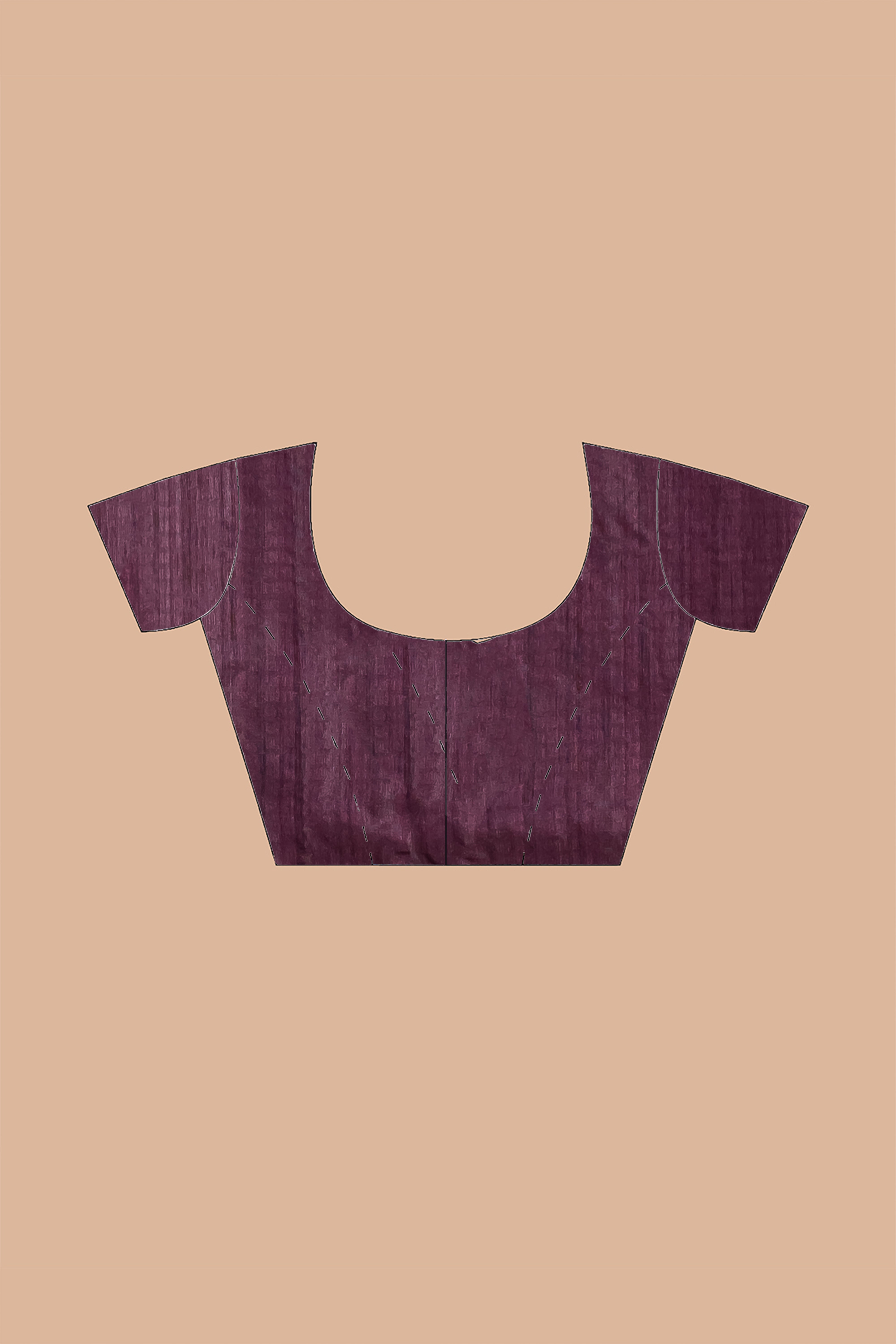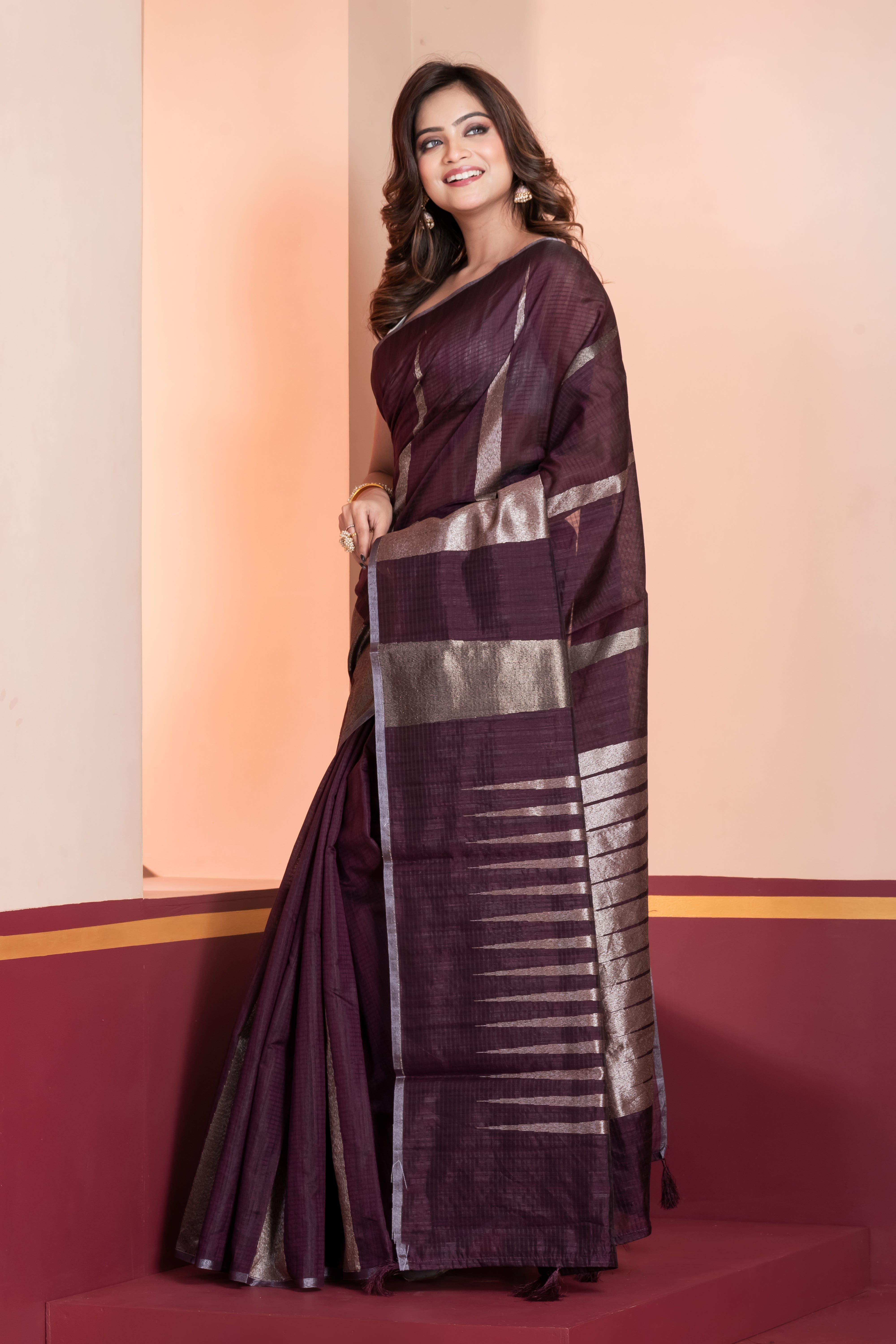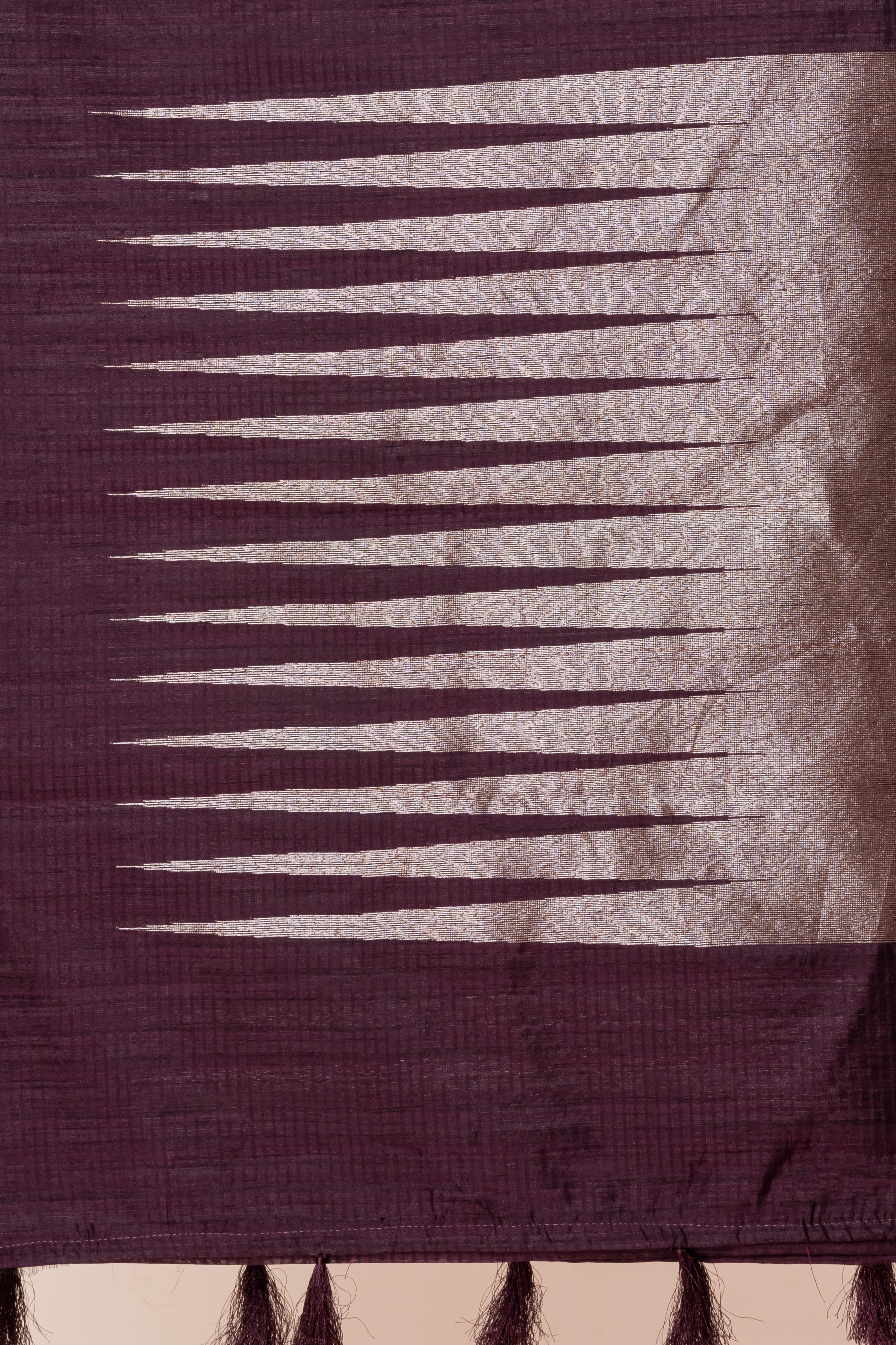 KAVVYA SOFT & LIGHT WEIGHT WINE HANDLOOM ROSE GOLD ZARI WEAVING SAREE IN TUSSAR FABRIC WITH BIG FLORAL MOTIFS. This stunning wine-colored handloom tussar saree features beautiful rose gold zari weaving with big floral motifs throughout, creating an elegant and luxurious look perfect for festive occasions and special celebrations.