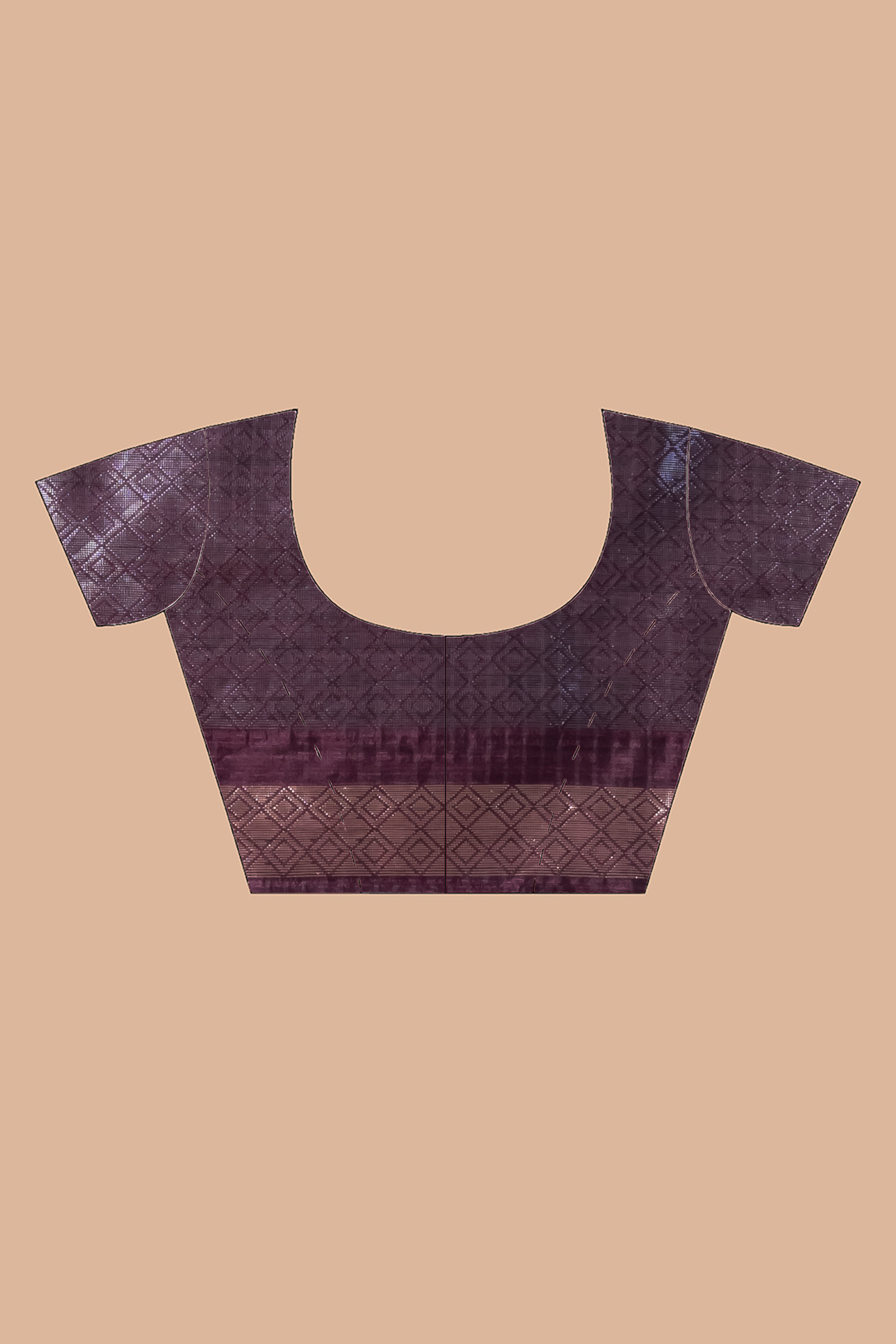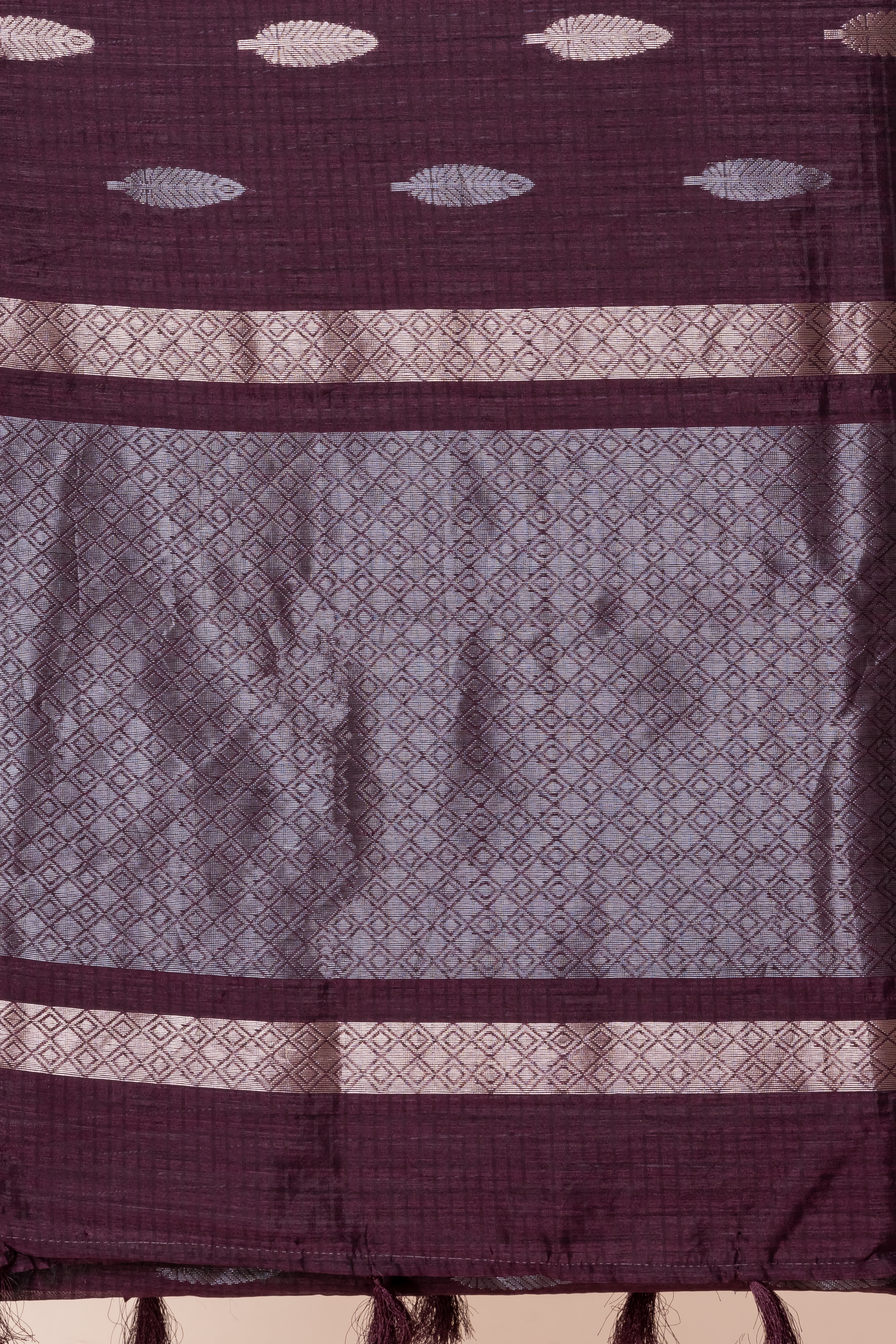 KAVVYA SOFT & LIGHT WEIGHT WINE HANDLOOM WEAVED SAREE WITH ALLOVER GOLDEN ZARI WEAVING. This exquisite wine-colored handloom saree features stunning golden zari weaving throughout, creating an elegant and luxurious look perfect for festive occasions and special celebrations.